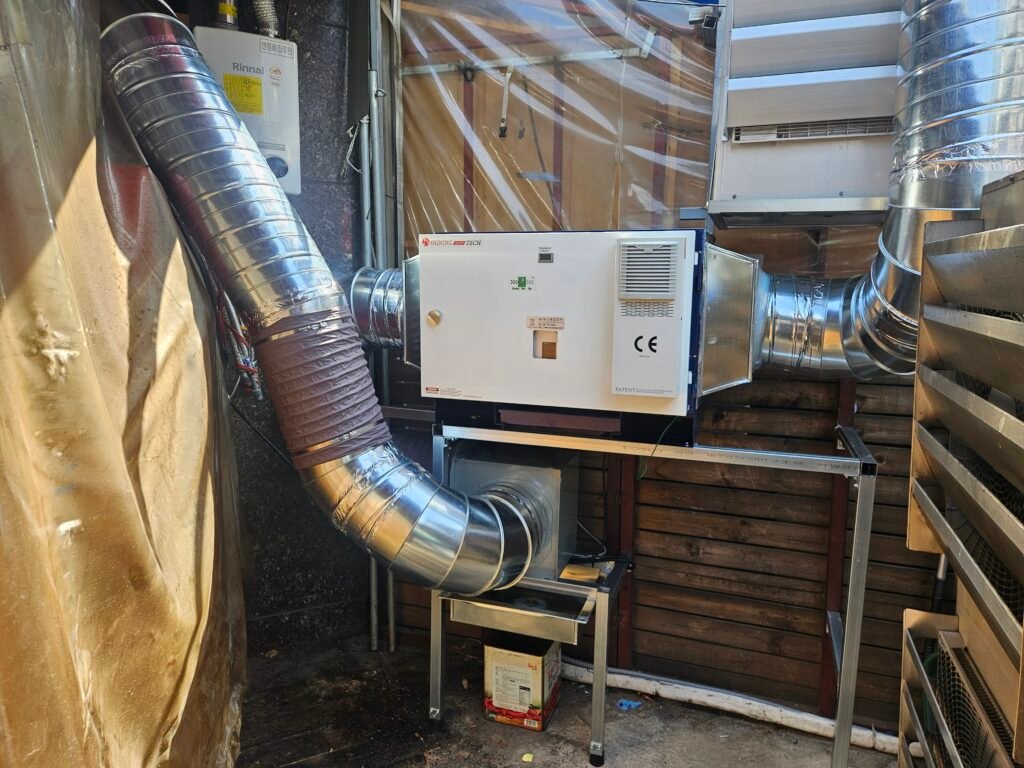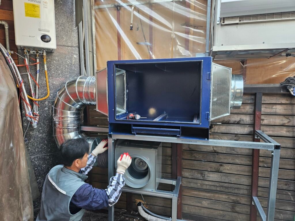 메뉴 특성상 연기가많이 배출되어서 주변상권에 피해가 안되도록 집진기를 설치하였으나 3마력의 모터에도 연기 및 바람이 배출이 안되고